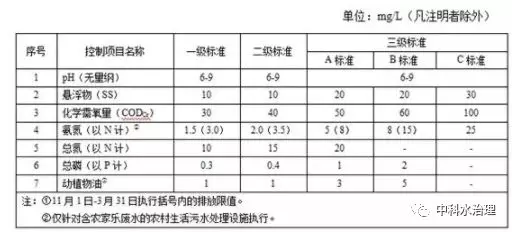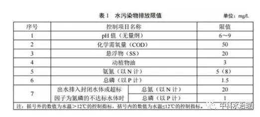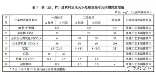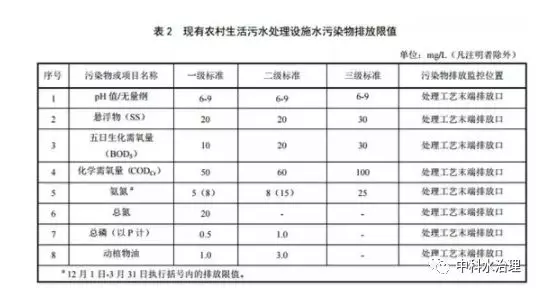規模大于 2m3 /d(含)的新建農村生活污水處理設施,水污染物排放限值按下表對應的規定執行。