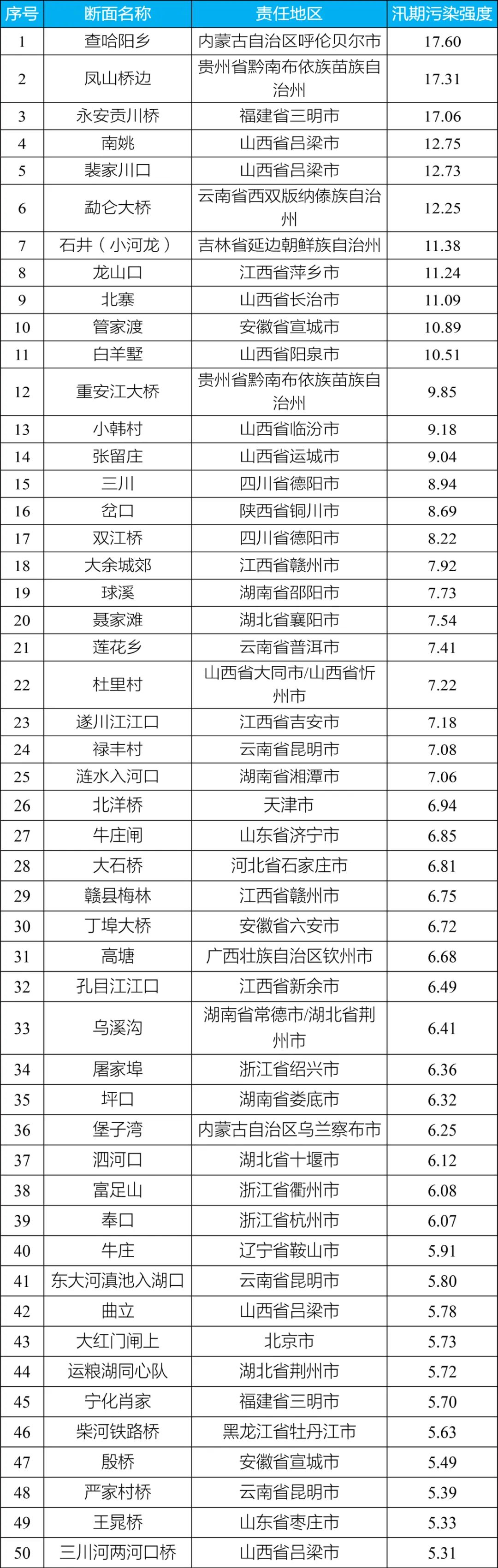 2022年上半年地表水汛期污染強(qiáng)度前50名斷面清單
